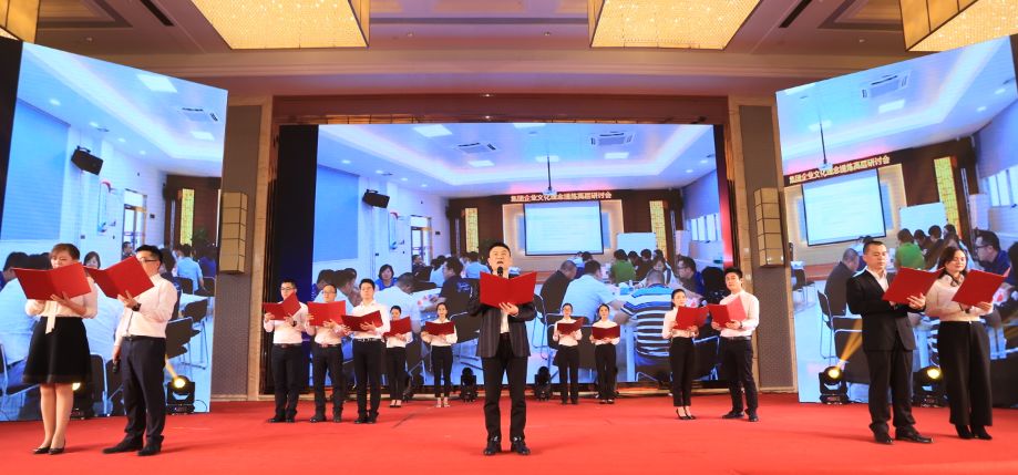 热热闹闹的鼓舞旗舞拉开了晚会的序幕,晚会共分为三个篇章,首先进入“同心,携手未来”企业文化发布会环节,沈董、王总与总监级及以上领导上台揭晓文化日,9.20成为乐鱼人的专属文化节日。